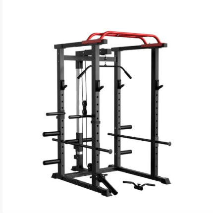 כלוב משקולות מקצועי עם מתח ומקבילים LANDMINE ארבעה מעמדים לפלטות משקולות צלחת בצדדים פולי עליון עם מוט אחיזה רחב פולי
