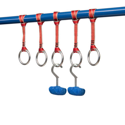 Ninja Hook Ball Grips Set! The set includes two small hook ball grips + 5 rings that serve as grip points for the hooks. The rings come with 35cm (13") long straps for hanging. Makes it possible to perform a hook transition (a transition in which the grip remains in the hand and is transferred from one anchor point to another).