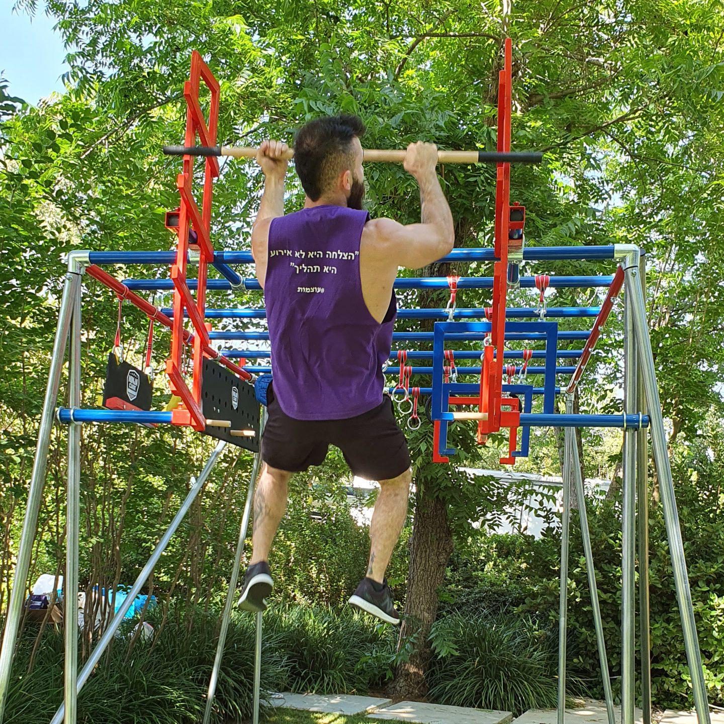 Ninja Cube - ninja facility for the garden - ideal for training for users of all ages! A ninja device without the need for anchoring serves as a basis for hanging and installing a huge variety of ninja grips and ninja training devices. The ninja facility for the garden was built in order to provide a modular solution for a variety of users in a limited area. The facility can be built on any level surface (soil, grass, concrete, and gravel) with a minimum size of 3x3 meters without the need for anchoring or fixing. The facility is safe to use, has an Israeli standard, and meets the requirements of the Ministry of Education for ninja activity.
