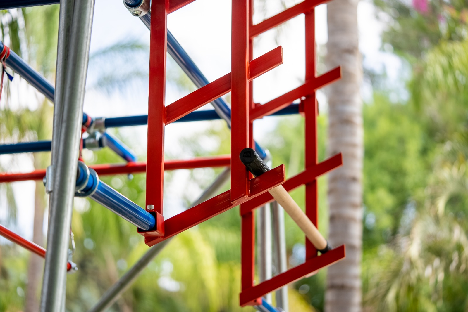 A wide variety of hanging accessories (rings, handles, balls, dynamite sticks, trapezoids, etc.) can be connected to the device as well as a basis for additional connections such as Peg Wall, Fire Rings, and more. Connections on the device can be changed/added and replaced easily, so it can cater to a variety of users and remain attractive over time... The device is modular and can be easily expanded, modified, dismantled, and assembled. a huge variety of elements of different difficulty levels and landing mats.